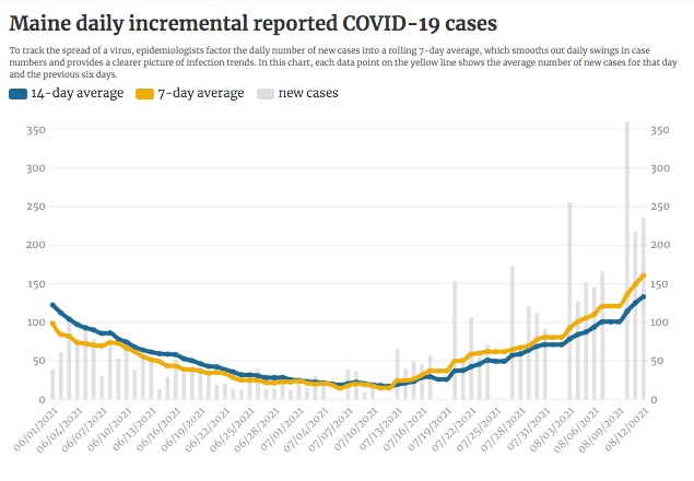 The Maine Center for Disease Control and Prevention on Saturday reported 188 new COVID-19 cases and no additional deaths, the latest addition to an ongoing summer surge. There were 68 patients with the coronavirus in hospitals around the state.